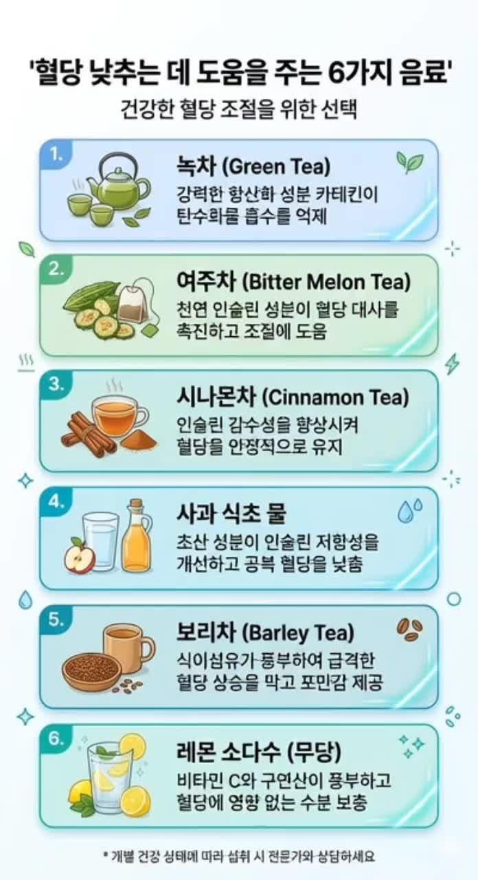 녹차: 카테킨 성분이 인슐린 감수성을 높여 식후 혈당이 급격히 상승하는 것을 억제하는 데 효과적입니다.